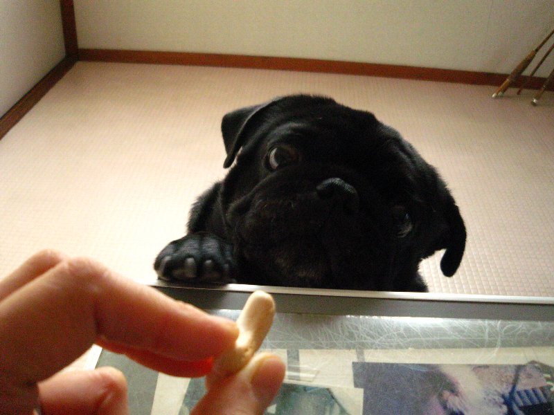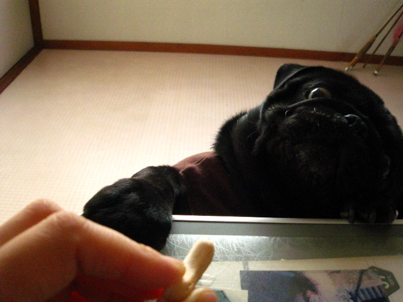 オヤツ欲しいのにギリギリ取れないところにオヤツを見せています。