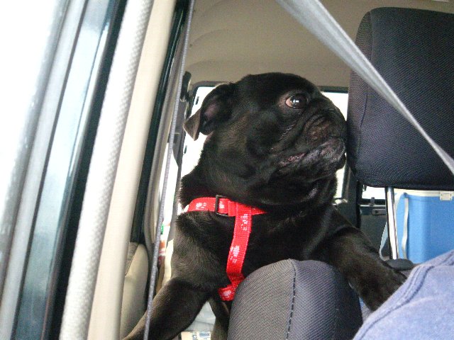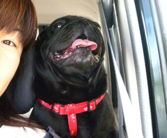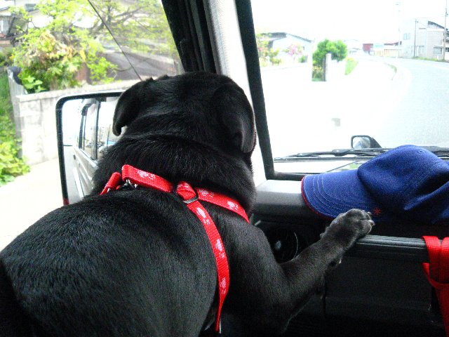 助手席の後ろから顔を出してきました