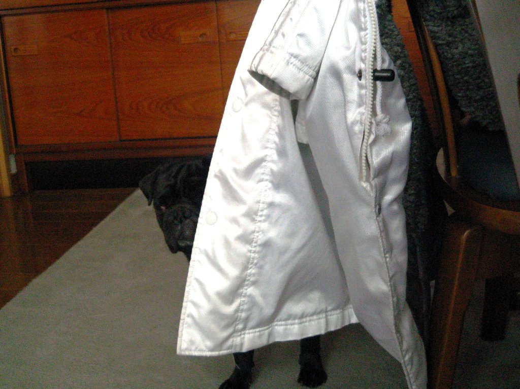 お散歩行く時いつも着ているベンチコート(?)の後ろから金太郎さんが見ていました(笑