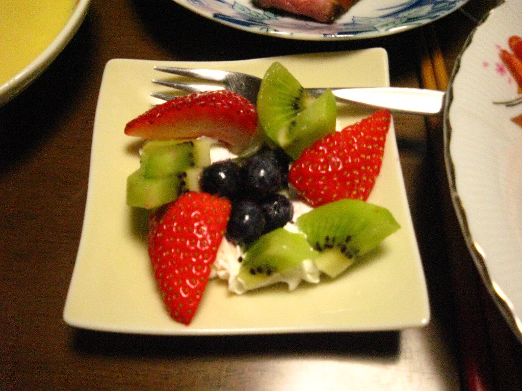 ピザ。 フルーツ(生クリームにイチゴ・キゥイ・ブルーベリーをのせてみました