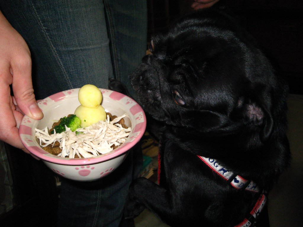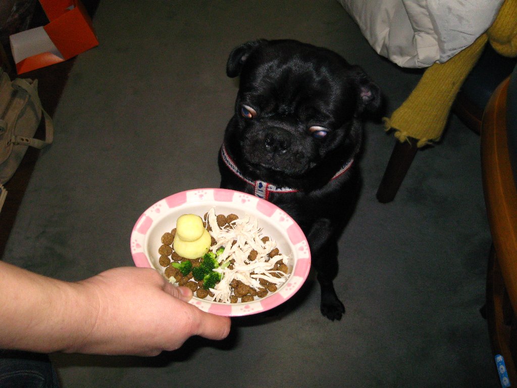 いつものフードに鳥のささ身・ブロッコリー・ジャガイモで作った雪だるまをのせてみました♪