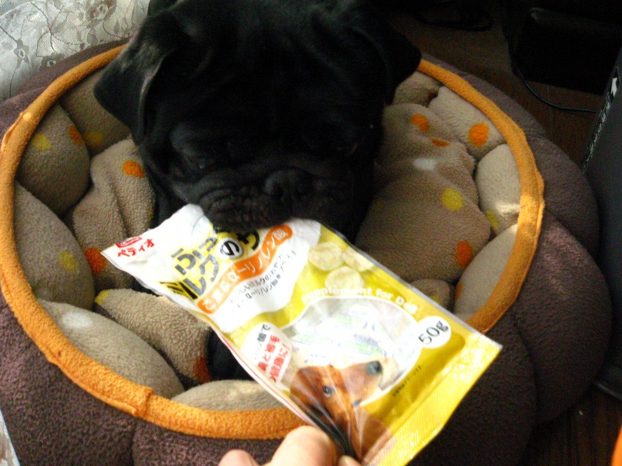 おぉ~~ お利口さんにお座りしてますね(^^ でも、目はオヤツに釘付けです(笑